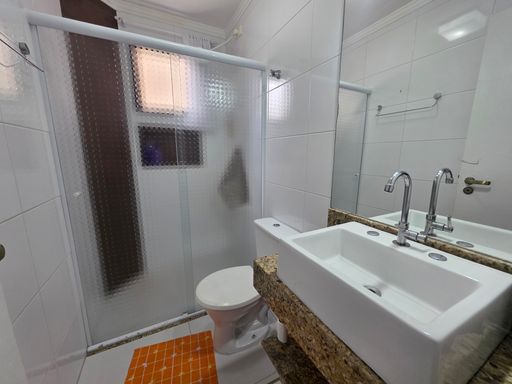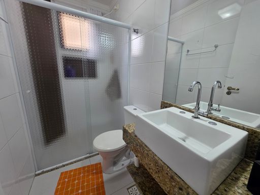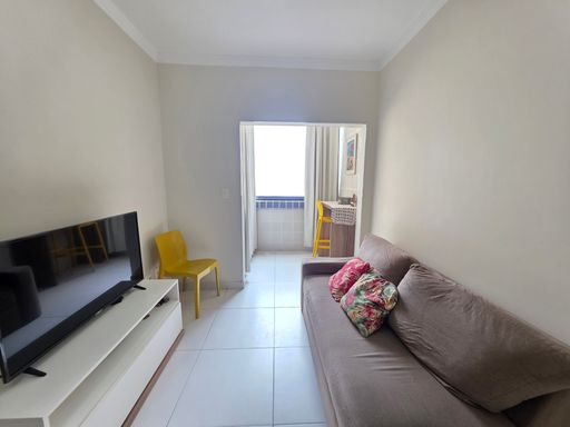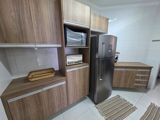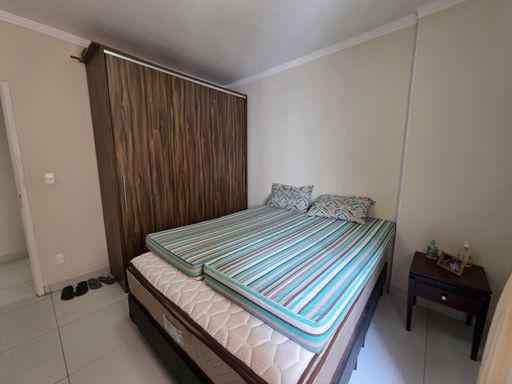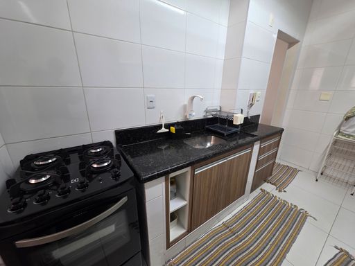 A sala é espaçosa, cozinha possui armários, e o quarto conta com cama de casal garantindo espaço para toda a família. Além disso, o prédio oferece churrasqueira a carvão, salão de festas e espaço gourmet, tornando-se um ótimo local tanto para morar quanto para investir em locação de temporada.