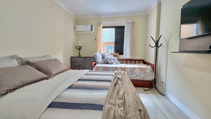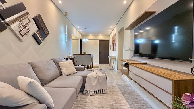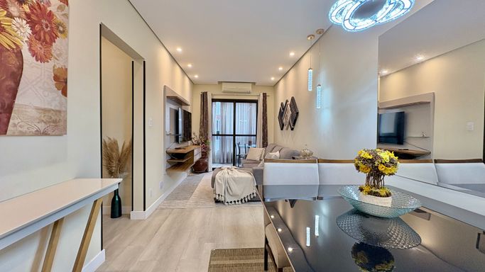 O apartamento possui 70 metros de área útil e conta com ambientes bem distribuídos. A sala é espaçosa, proporcionando um ambiente confortável para o dia a dia. A cozinha é mobiliada e o imóvel conta com 1 quarto mobiliado, além de 1 lavabo que atende à planta do apartamento. O imóvel possui ar condicionado instalado na sala e no quarto, contribuindo para maior conforto nos ambientes.