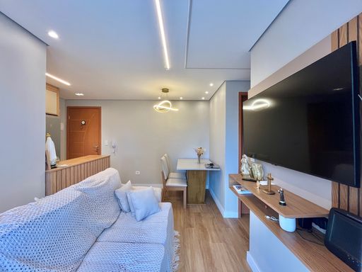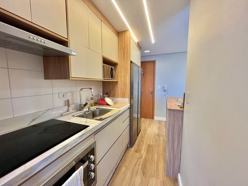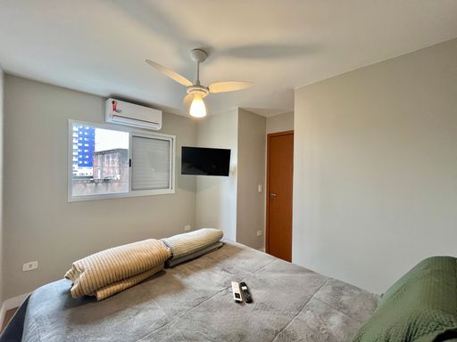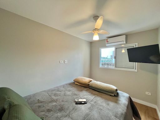 Apartamento semimobiliado com armários planejados, aquecedor a gás, ventiladores de teto e painel de TV