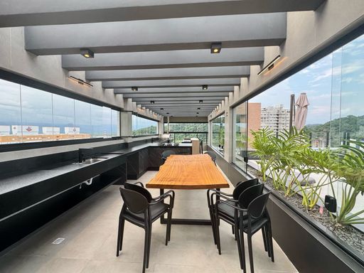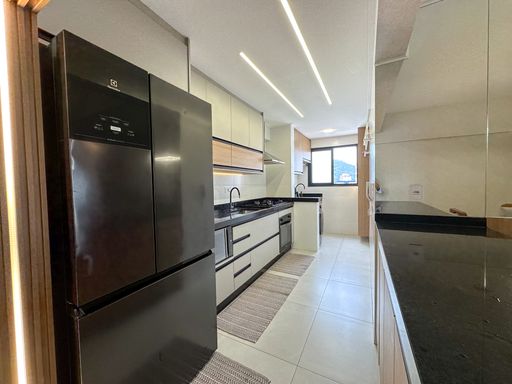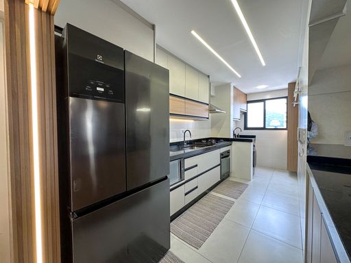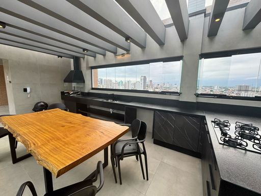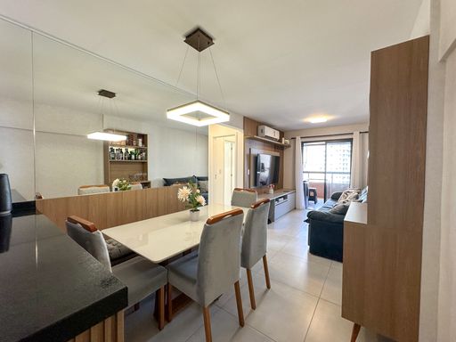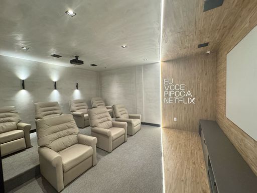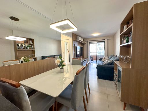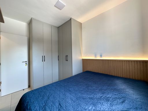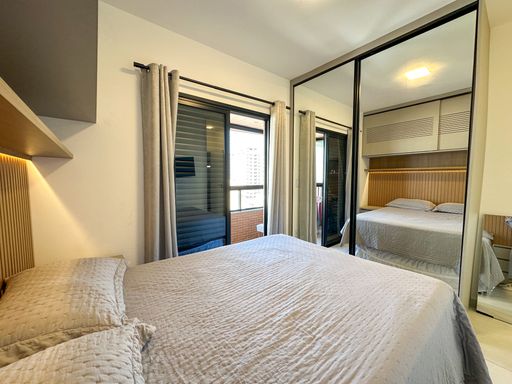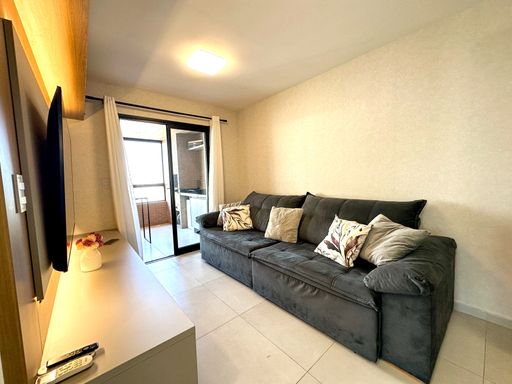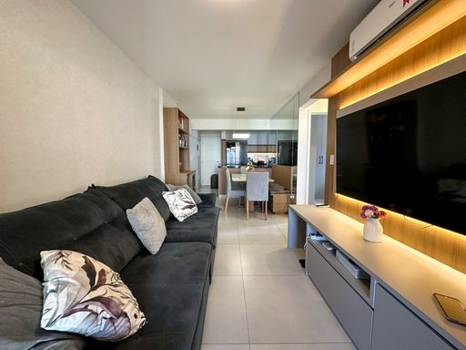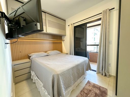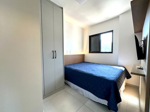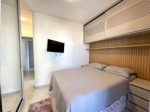 O apartamento oferece sacada gourmet com churrasqueira a carvão, ar condicionado em todos os ambientes, sala espaçosa e mobiliada, cozinha planejada e quartos com móveis planejados. O empreendimento complementa a experiência com portaria remota e uma estrutura completa de lazer, incluindo piscina, cinema, salão de festas, salão de jogos, sauna, brinquedoteca, academia e solarium.