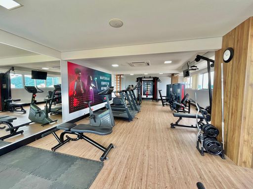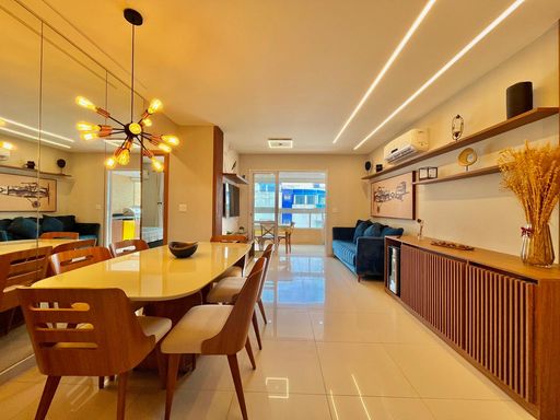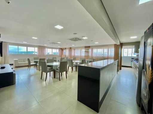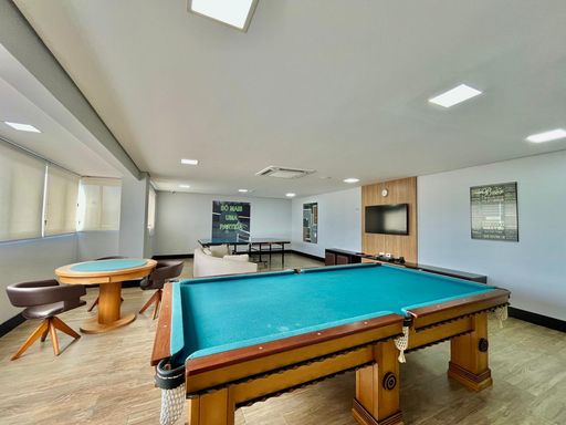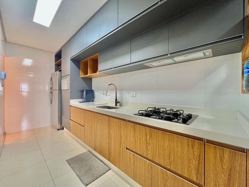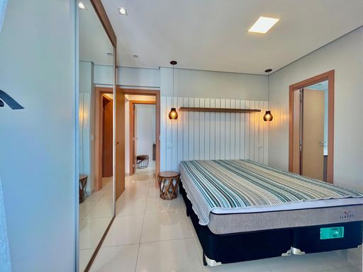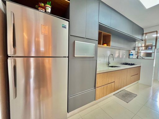 A sala é espaçosa, bem iluminada e mobiliada, integrada à sacada gourmet com churrasqueira, perfeita para momentos de lazer e confraternização. A cozinha é planejada, oferecendo organização e aproveitamento inteligente dos espaços, enquanto os quartos contam com móveis planejados, proporcionando conforto e funcionalidade. O imóvel possui ar condicionado, mobília inclusa e duas vagas de garagem, além de aceitar financiamento bancário, facilitando a aquisição.