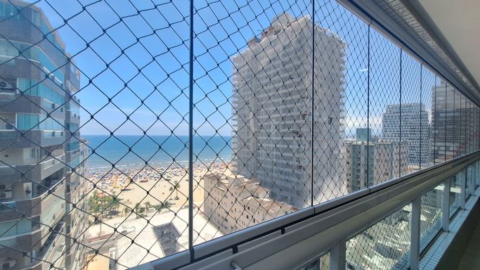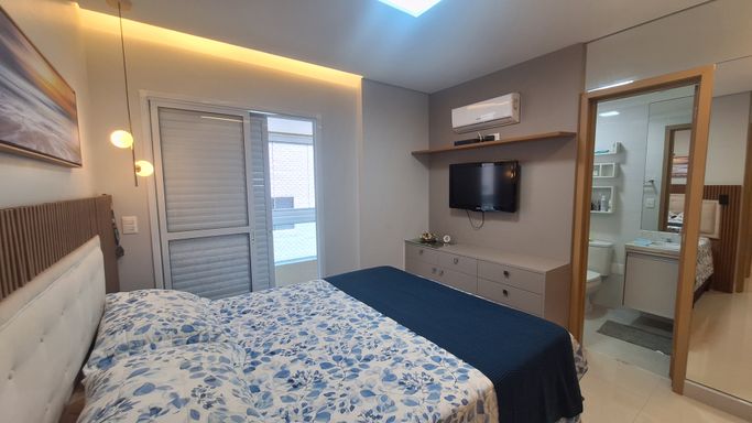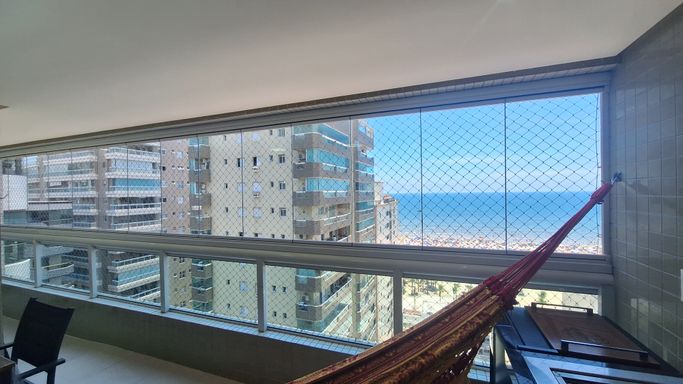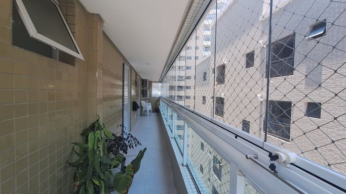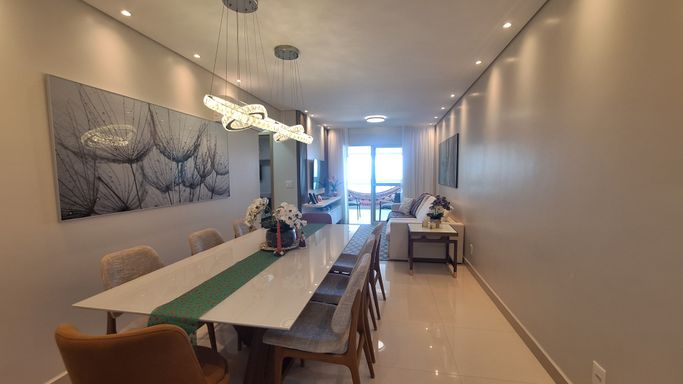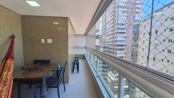 Este apartamento à venda em Praia Grande no bairro Canto do Forte está localizado a 100 metros de distância da praia e oferece 105 metros de área útil, com uma planta bem distribuída. O imóvel aceita financiamento bancário e possui duas suítes, uma dependência transformada em home office, um lavabo e quatro banheiros sociais. A sala é espaçosa e mobiliada, integrada à sacada gourmet com churrasqueira elétrica, criando um ambiente funcional para o uso diário.