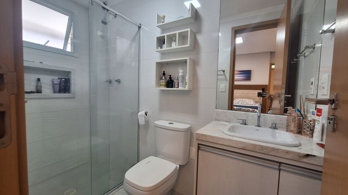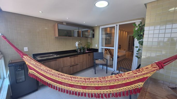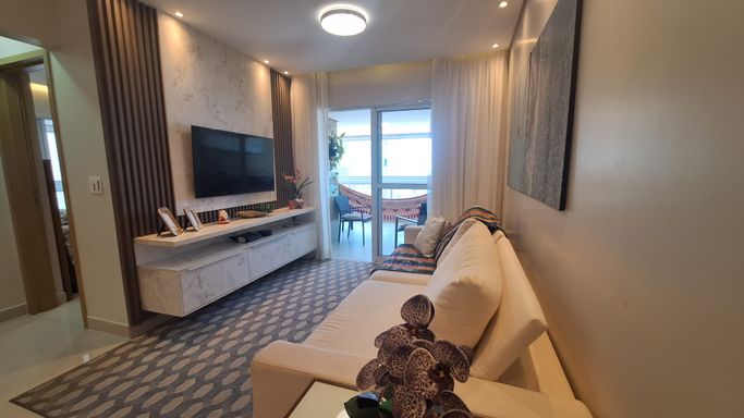 A cozinha é planejada e os quartos contam com móveis planejados, mantendo organização e praticidade. O apartamento possui ar condicionado na sala e nas suítes, duas vagas de garagem demarcadas e será entregue com a mobília inclusa, sendo retirados apenas itens pessoais e de decoração.