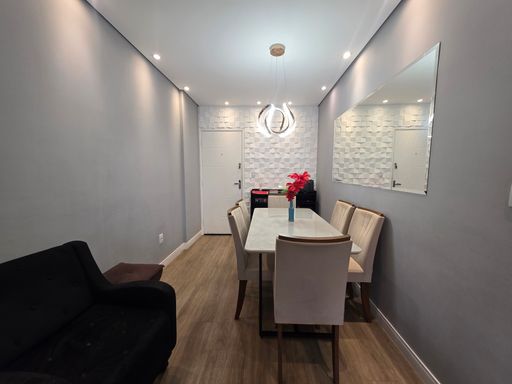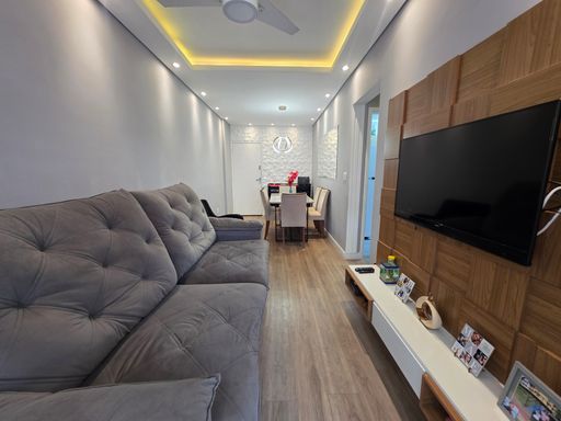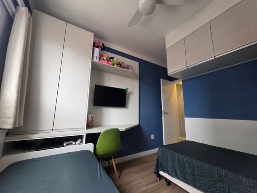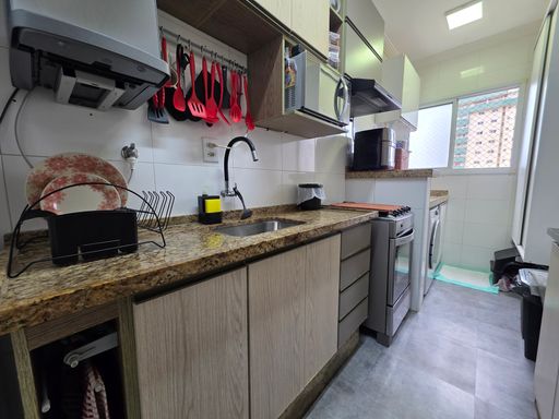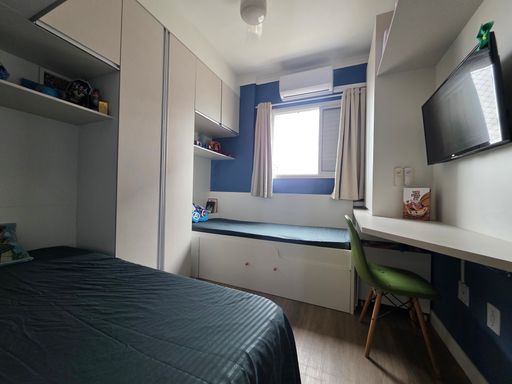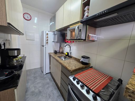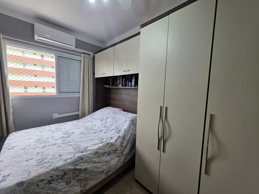 O apartamento conta com dois quartos equipados com ar-condicionado e móveis planejados, além de uma sala espaçosa e mobiliada que proporciona um ambiente aconchegante para toda a família. A cozinha planejada oferece praticidade no dia a dia, enquanto o banheiro social complementa o espaço de forma eficiente. A sacada garante ventilação natural e um espaço agradável para relaxar.