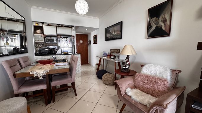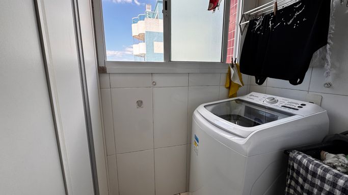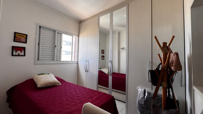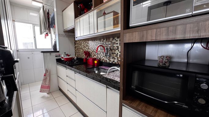 O apartamento possui dois quartos, sendo uma suíte, além de um banheiro social que atende aos demais ambientes. A infraestrutura para ar-condicionado está presente em todos os cômodos, para garantir maior conforto térmico. O imóvel permanecerá somente com a mobília planejada. A vaga de garagem é coletiva e o imóvel está disponível somente para pagamento à vista.