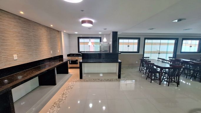 O condomínio oferece estrutura completa com portaria presencial, piscina, salão de festas, salão de jogos, sauna, academia e seis churrasqueiras na cobertura. O imóvel aceita financiamento bancário.