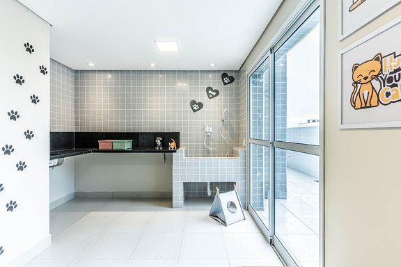 A sacada gourmet possui ponto elétrico para churrasqueira, ampliando o uso do espaço. A cozinha é planejada e um dos quartos dispõe de porta balcão com acesso à varanda, proporcionando melhor integração entre os ambientes internos e externos.