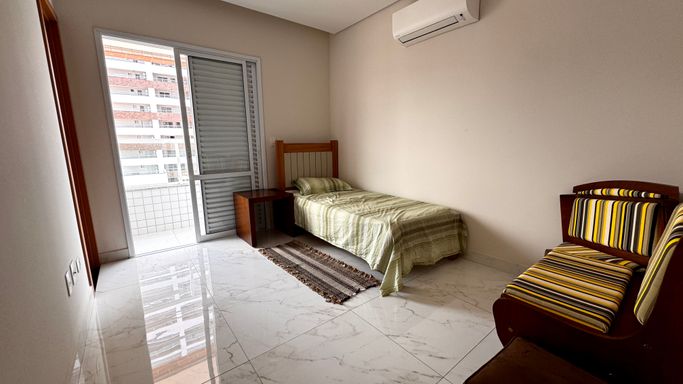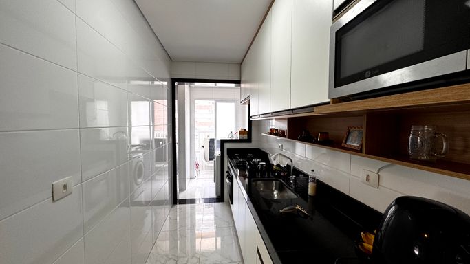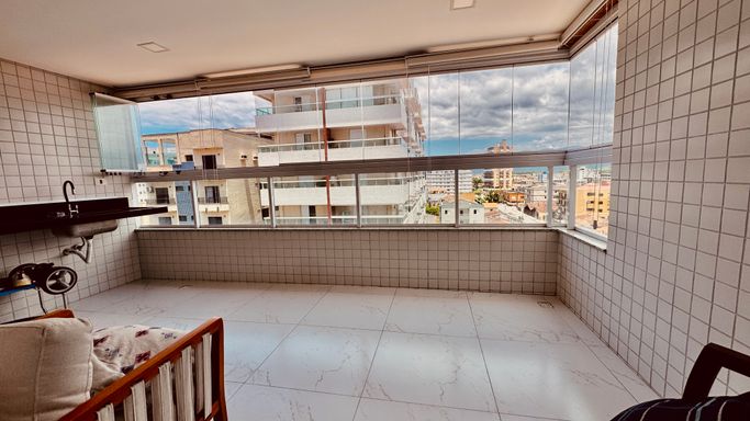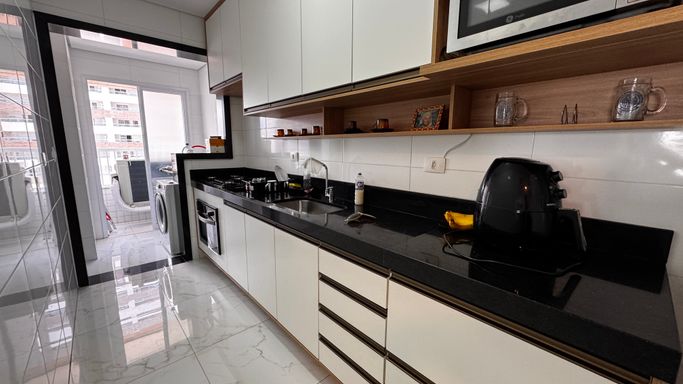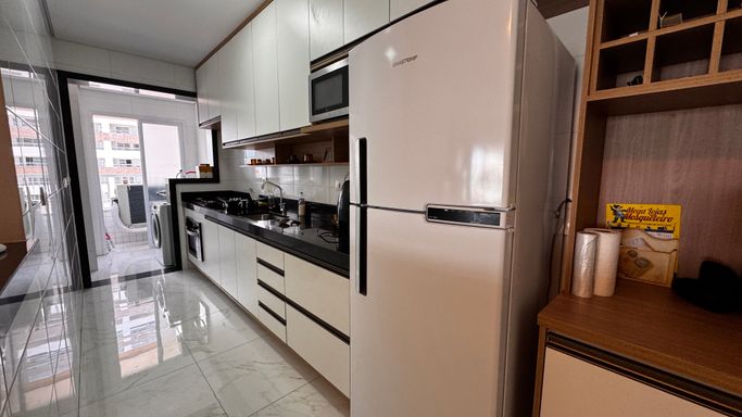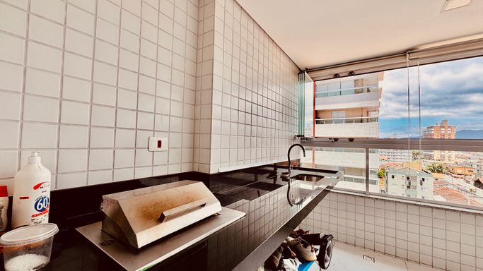 Este apartamento à venda em Praia Grande na Vila Caiçara aceita financiamento bancário e está localizado a 350 metros de distância da praia. Com 86 metros de área útil, o imóvel possui ambientes bem distribuídos e funcionais. A sala é espaçosa e mobiliada, integrada à sacada gourmet, que conta com churrasqueira elétrica, proporcionando praticidade no uso do espaço. A cozinha é planejada e os quartos possuem móveis planejados, otimizando a organização interna do apartamento.