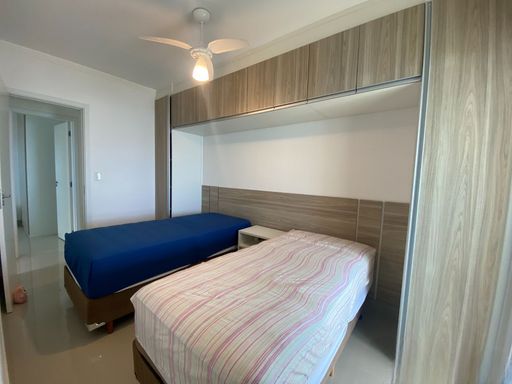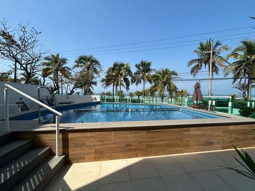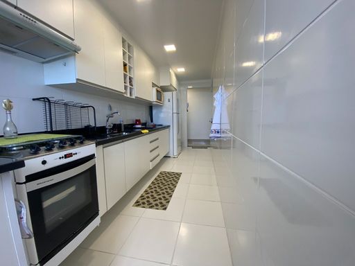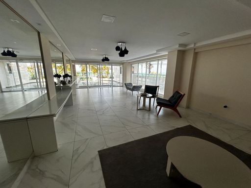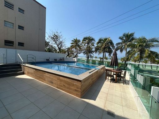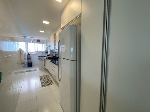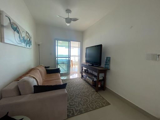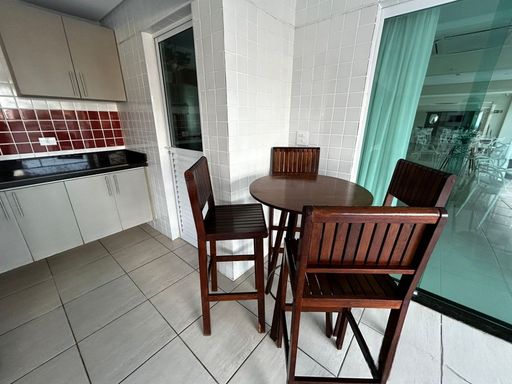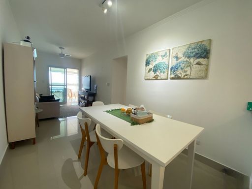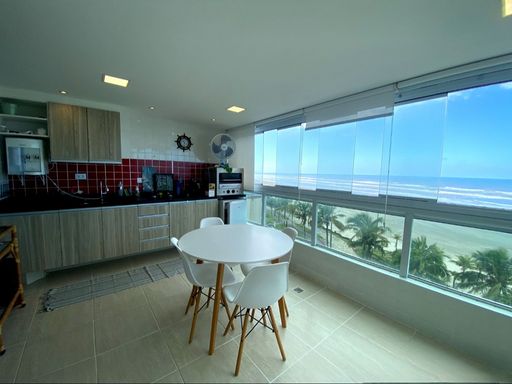 A sala é espaçosa e mobiliada, integrada à sacada gourmet, proporcionando um ambiente agradável com vista frontal para o mar. A cozinha é planejada e o apartamento está totalmente mobiliado. A mobília está inclusa, com retirada apenas dos itens pessoais, devendo ser combinada na proposta. O imóvel possui duas vagas livres de garagem e aceita financiamento bancário.