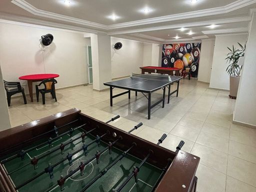 O apartamento possui ar condicionado, duas vagas demarcadas e está disponível para financiamento bancário. O empreendimento oferece infraestrutura completa com portaria 24 horas, piscina, salão de festas, salão de jogos e academia.
