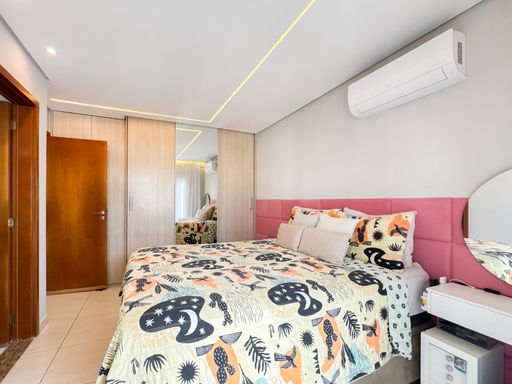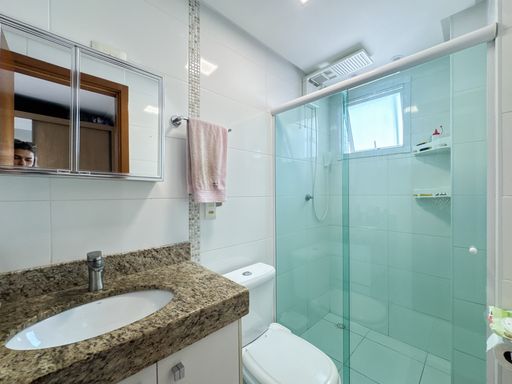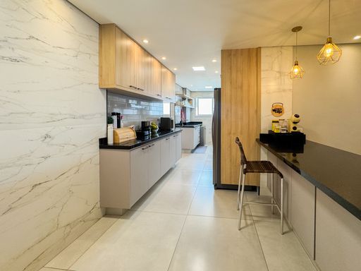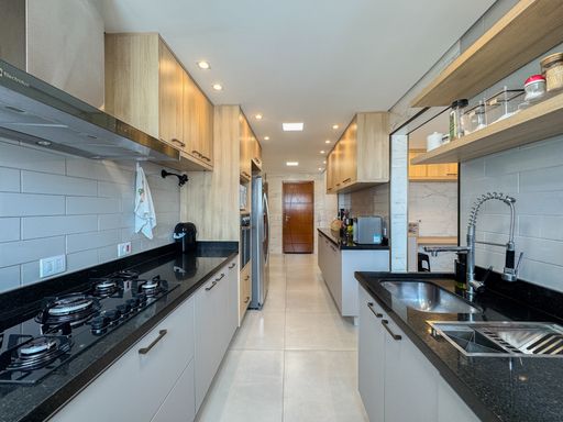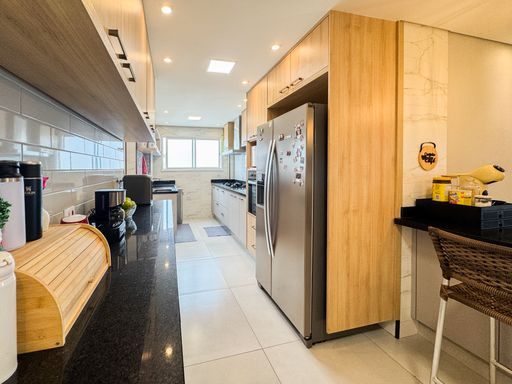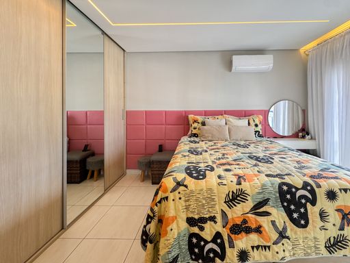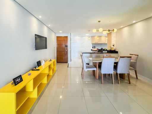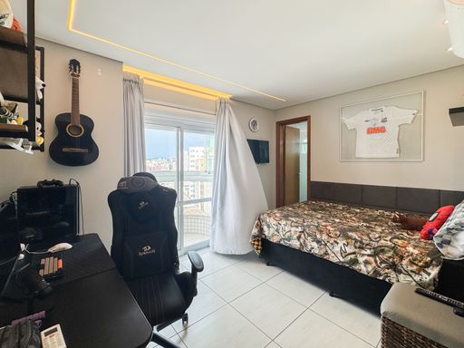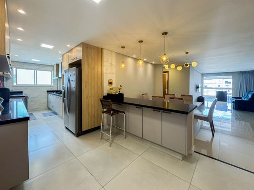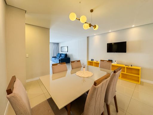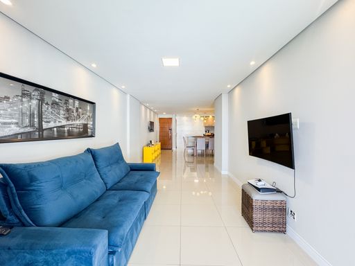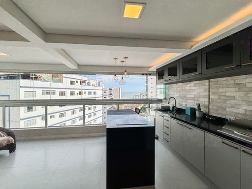 A área social conta com sacada gourmet equipada com churrasqueira à gás, integrada ao ambiente interno, valorizando a convivência e a vista privilegiada. O imóvel possui móveis planejados, ar condicionado instalado, garantindo praticidade no dia a dia. Os quartos são espaçosos e contam com vista para o mar. O apartamento dispõe de três vagas de garagem e aceita financiamento bancário.