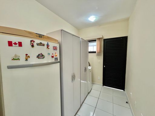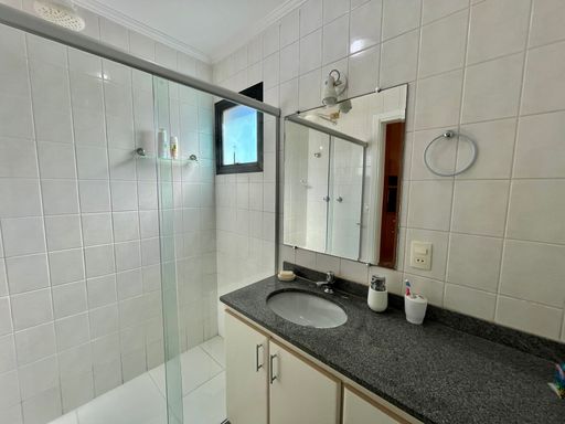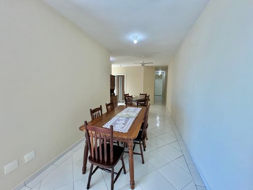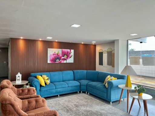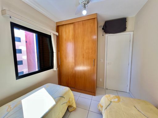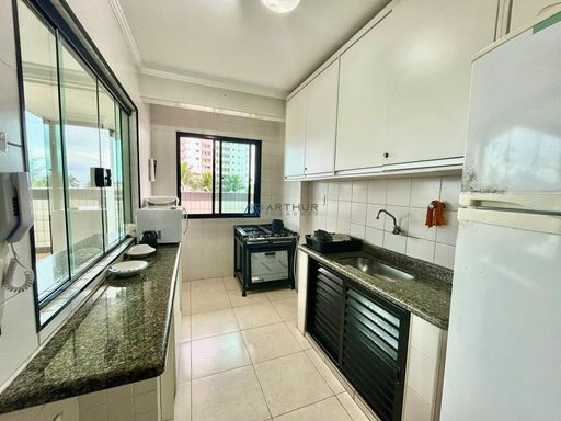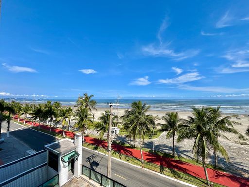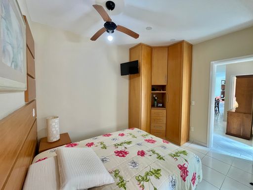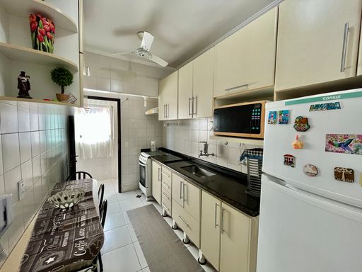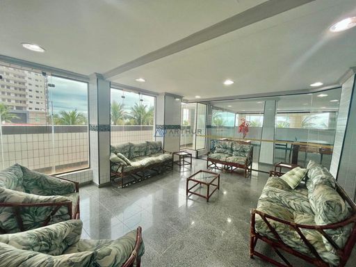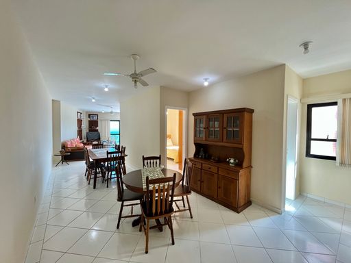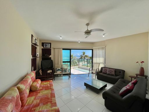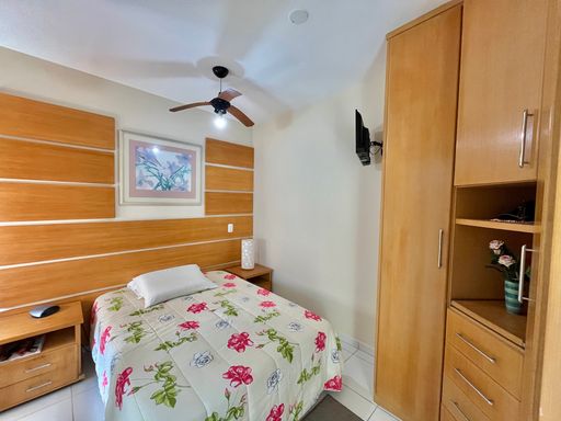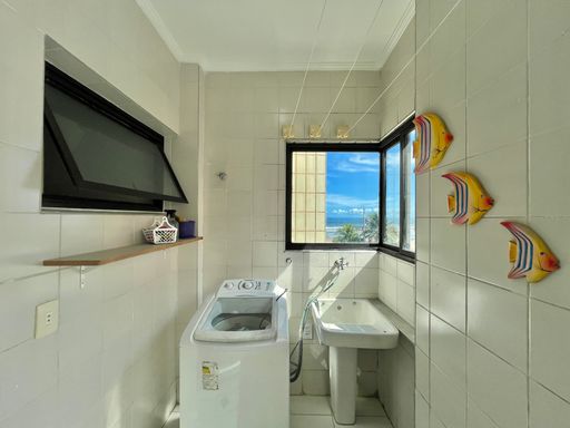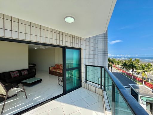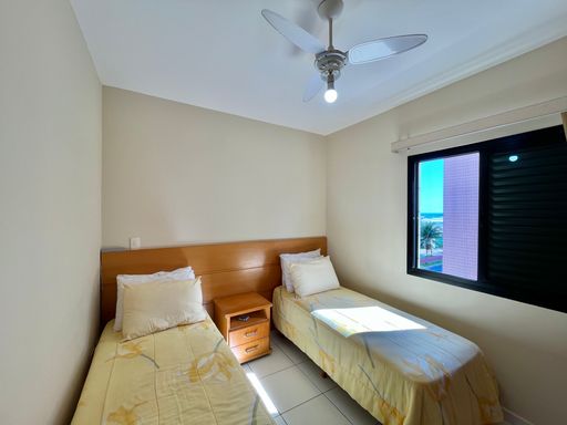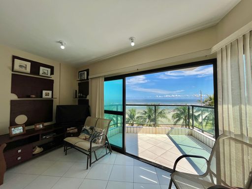 O apartamento conta com 3 quartos, sendo 1 suíte, 2 banheiros sociais e 1 lavabo, além de uma vaga de garagem livre. A sala é ampla e mobiliada, ideal para receber familiares e amigos, e a cozinha planejada garante praticidade no dia a dia. Todos os ambientes possuem ventilação natural e ventiladores, proporcionando conforto térmico em qualquer época do ano. A sacada com vista frente mar é um dos grandes destaques, oferecendo uma paisagem encantadora e momentos de tranquilidade junto à brisa do mar.