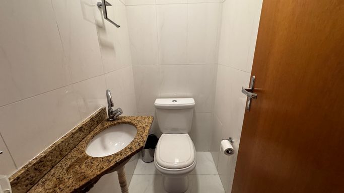 O apartamento possui três quartos, todos suítes, além de um lavabo que atende a área social. A infraestrutura para ar-condicionado está presente em todos os ambientes. A mobília está inclusa, sendo que serão retirados apenas os itens pessoais e a decoração. O imóvel dispõe de duas vagas de garagem.