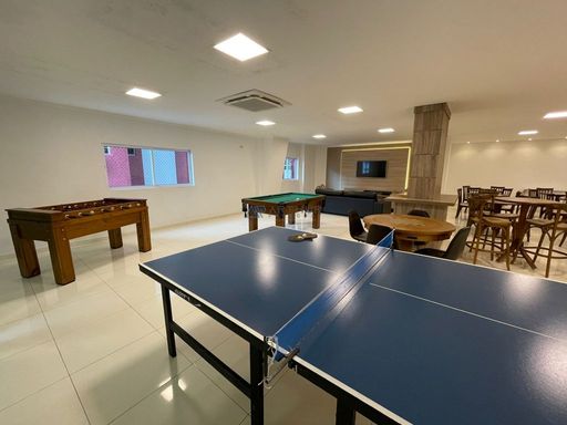 A cozinha planejada oferece praticidade no dia a dia, e os quartos contam com móveis planejados, otimizando o espaço e garantindo um ambiente organizado. O apartamento será vendido com mobília planejada e aparelhos de ar-condicionado, pronto para receber seus novos moradores. O empreendimento oferece portaria eletrônica, piscina aquecida, salão de festas, salão de jogos, sauna e academia, garantindo lazer e segurança em um só lugar.