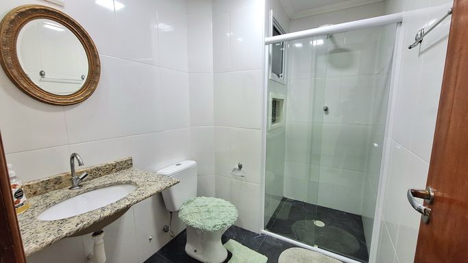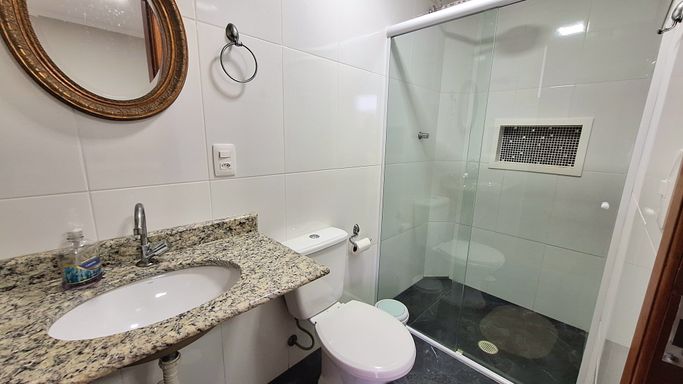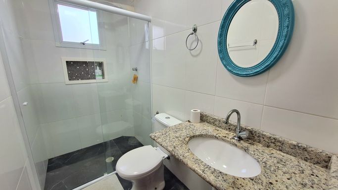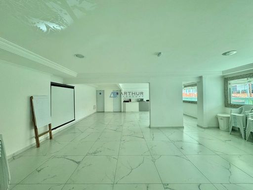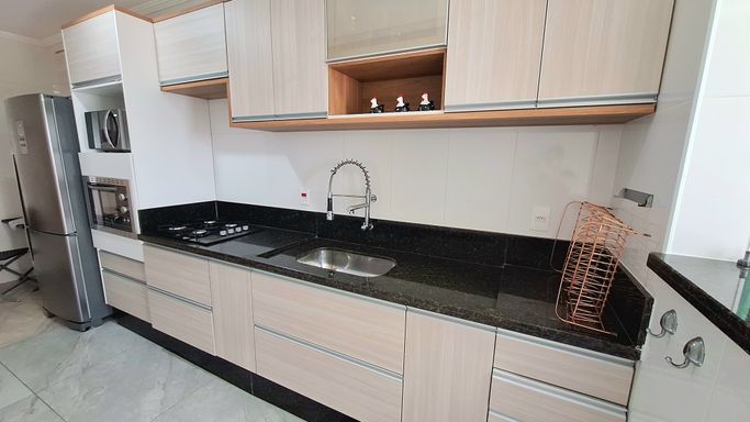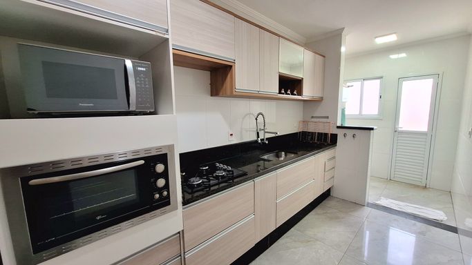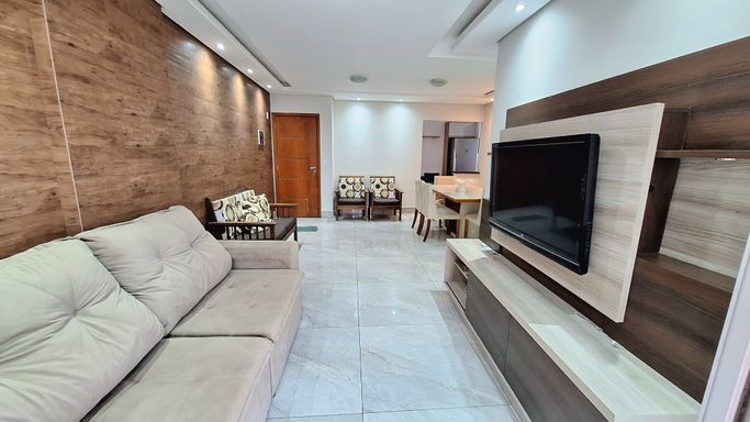 O apartamento conta com três quartos, sendo duas suítes, um banheiro social e um lavabo, oferecendo conforto para toda a família. A sala é espaçosa e mobiliada, integrada a uma sacada gourmet com churrasqueira a carvão, perfeita para reunir amigos e familiares. A cozinha é planejada e funcional, com excelente aproveitamento de espaço. Todos os ambientes possuem ar-condicionado, garantindo conforto térmico durante todo o ano.