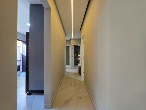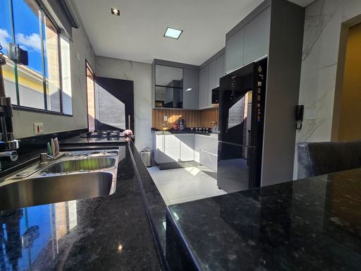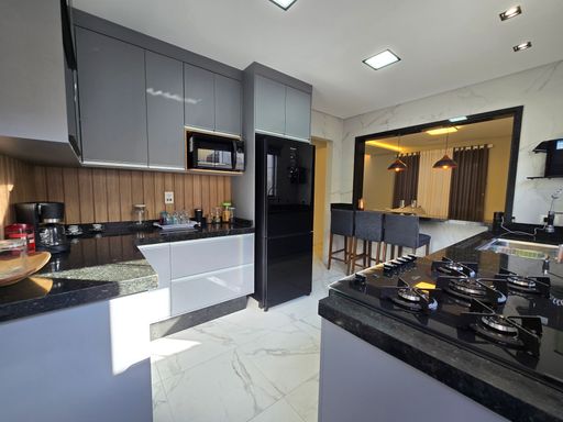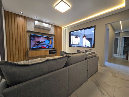 O espaço gourmet com churrasqueira à carvão e piscina proporciona momentos de lazer e convivência. O sistema de som ambiente JBL, presente tanto no interior da casa quanto na área gourmet, adiciona um toque de exclusividade e sofisticação. Todos os móveis são novos, incluindo os planejados, e os ambientes contam com ar condicionado, iluminação em LED embutida e papel de parede decorativo. A sala espaçosa e a cozinha planejada completam o conforto e a funcionalidade do imóvel, que foi totalmente reformado com acabamentos de alto padrão.